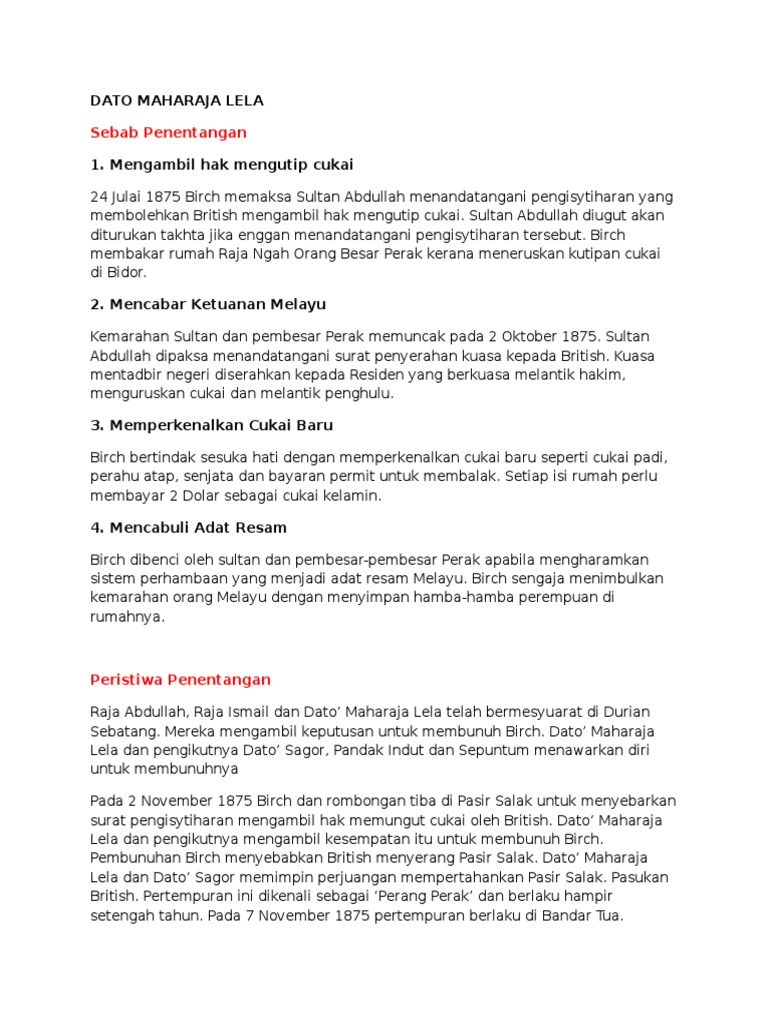 Buku Bab 7 Pdf Pdf Document from reader016.fdokumen.com Beliau berketurunan daeng selili, anak raja bugis yang berasal dari daerah luwuk, sulawesi. Dato seri maharaja lela abdullah. Raja abdullah,raja ismail dan dato' maharaja lela bermesyuarat di durian sebatang.mereka mengambil keputusan akan membunuh birch.ia dilakukan oleh dato' sagor,pandak induk dan sepuntum. He is the son of the bugis king which is the descendant of daeng salili. For faster navigation, this iframe is preloading the wikiwand page for dato maharaja lela. Dato' maharaja lela ialah pembesar kelapan perak yang merupakan pejuang bangsa yang bertanggungjawab kepada sumpah dan janjinya. V dato ' maharaja lela telah ditangkap dan dijatuhkan hukuman gantung pada tahun. Aku pantang sangat orang kacau agama aku dan bangsa aku!